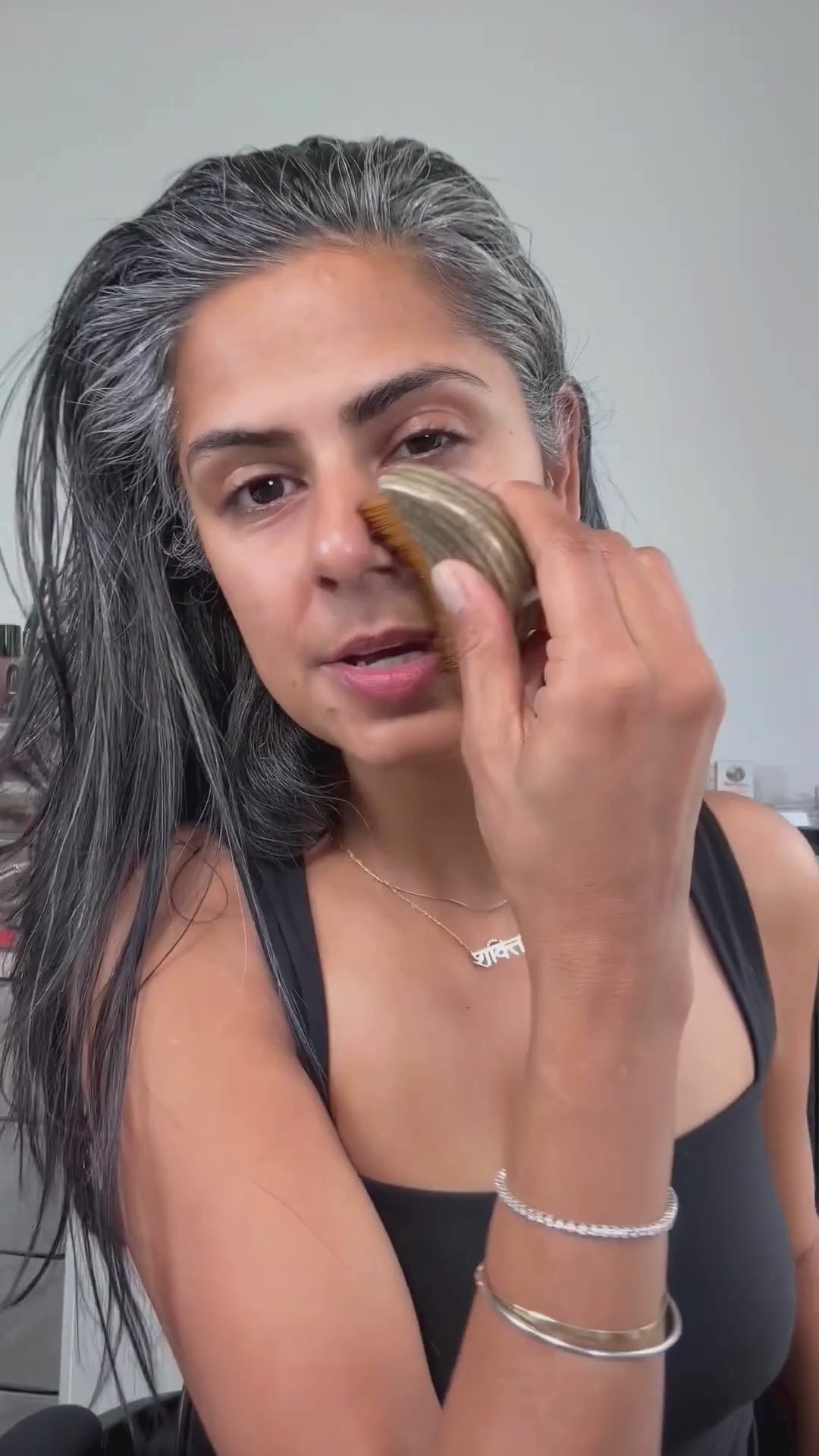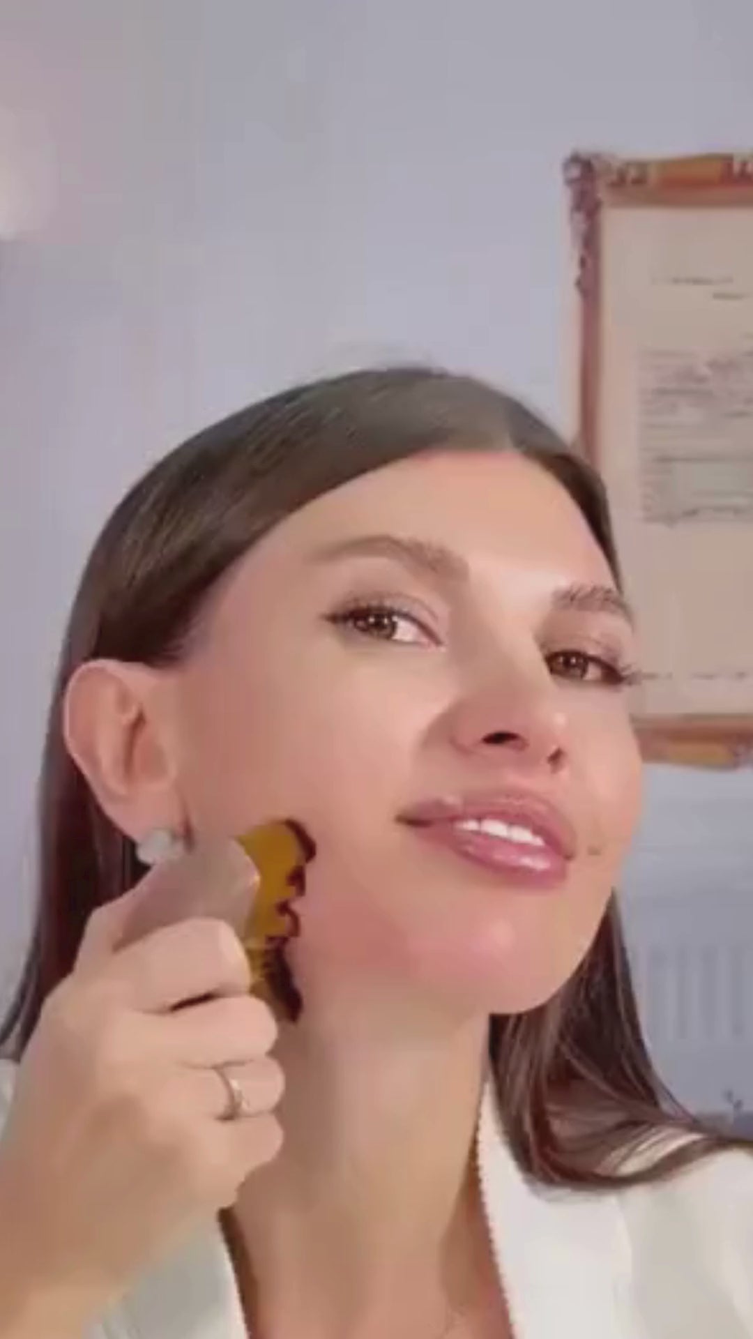 Sur peau propre et sèche, utilise une pression très légère. Commence au cou, remonte vers la mâchoire, puis brosse du centre du visage vers l’extérieur, sous les yeux, joues, tempes. 2 à 3 minutes par jour suffisent.